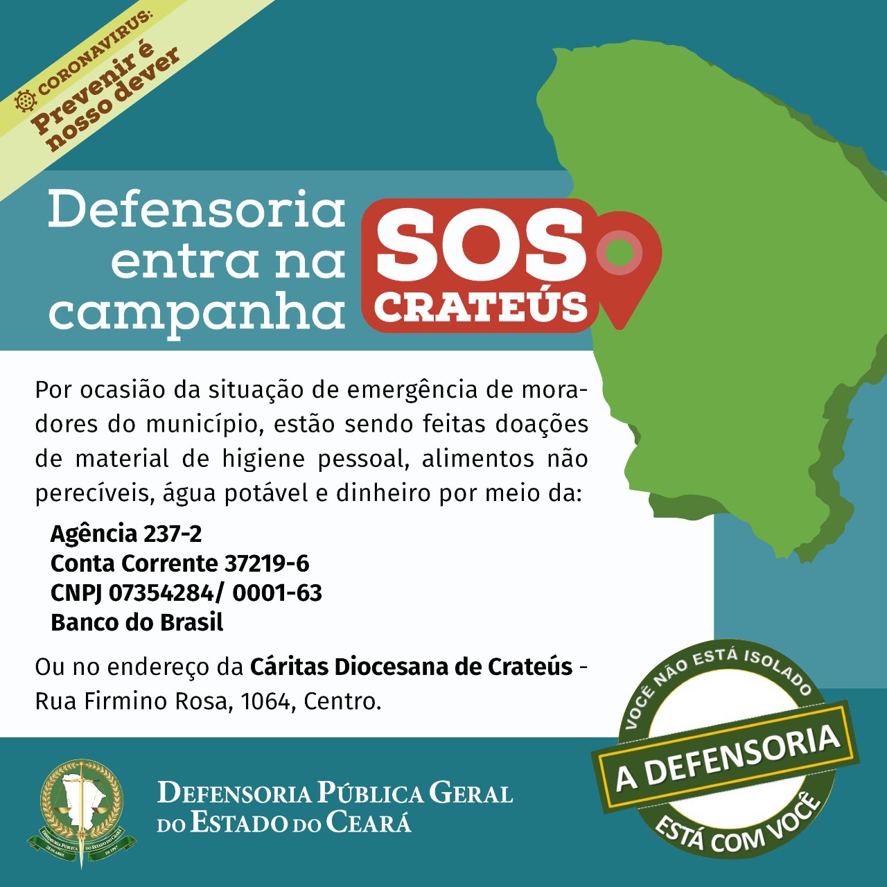 O defensor público Augusto Rodrigues, que atua na cidade, ressalta o papel da Defensoria neste momento para o atendimento à população. “Nós, da Defensoria em Crateús, fizemos uma doação de mantimentos, como particulares, e convidamos aqueles que puderem contribuir que também participem da campanha e estamos à disposição daqueles que precisarem de assistência jurídica nesse momento delicado e difícil”, afirma. Os defensores estão atendendo em escala de teletrabalho e é possível entrar em contato através do número (88) 99423-9577, ou pelo e-mail crateus@defensoria.ce.def.br.
