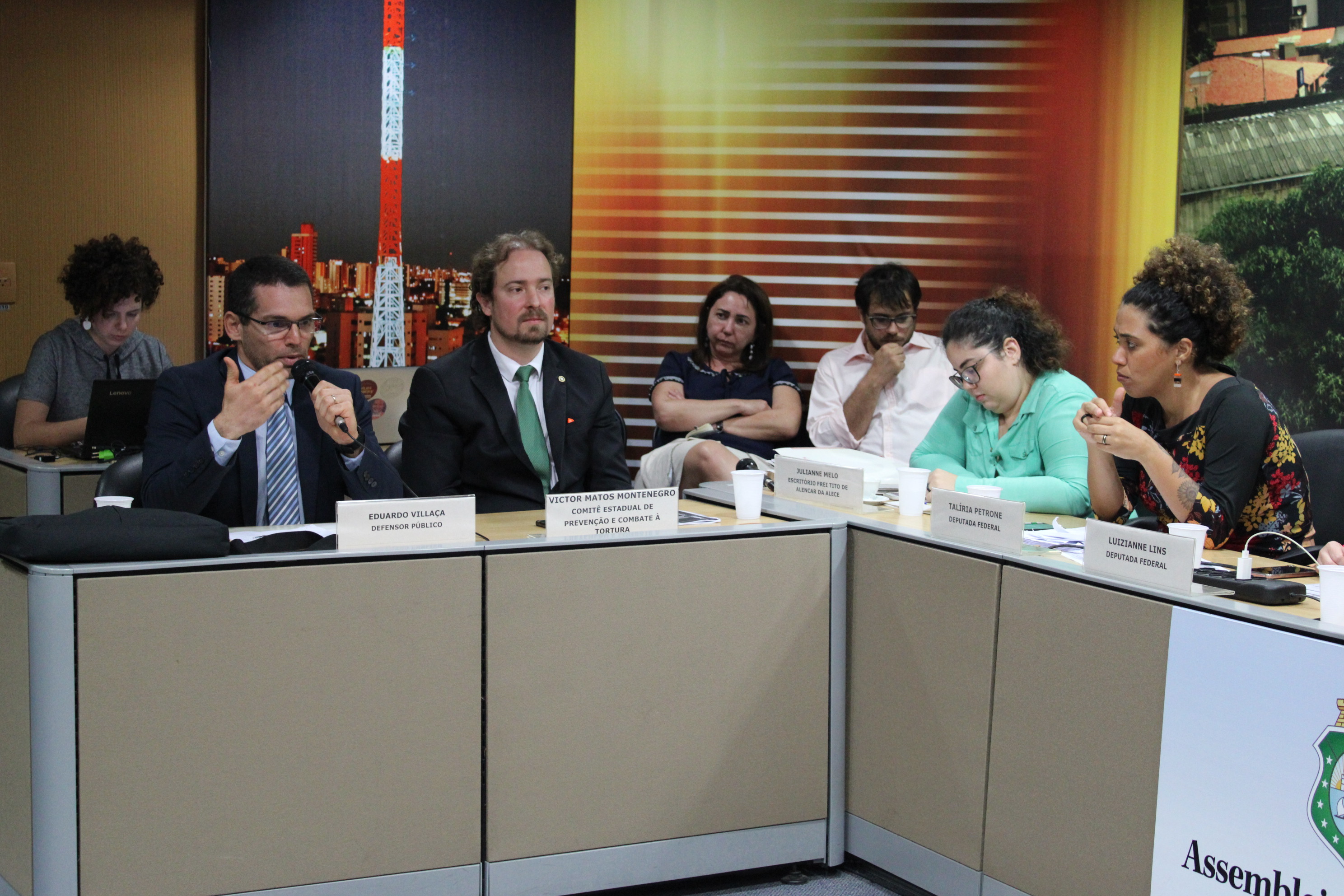 A Defensoria Pública do Estado do Ceará participou, na semana passada, de duas audiências públicas dedicadas ao debate sobre o sistema prisional cearense. Na última sexta-feira (6), a discussão sobre o tema ocorreu na Assembleia Legislativa do Estado do Ceará (ALCE), a partir de iniciativa da Comissão de Direitos Humanos e Minorias da Câmara Federal, em ocasião da visita de deputados federais ao Ceará. A programação dos membros da comissão ocorreu nos dias 5 e 6, com objetivo de realizar diligências junto a gestores do sistema prisional e sociedade civil. A motivação da visita foram os dados do relatório feito pelo Mecanismo Nacional de Prevenção e Combate à Tortura, que esteve no Ceará em abril deste ano.