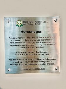 A Defensoria Pública homenageou nesta sexta-feira (30/7) membros, colaboradores, colaboradoras, estagiários e estagiárias de todo o Estado que atuaram nos 500 primeiros dias de pandemia do novo coronavírus (Covid-19) no Ceará. Em alusão ao trabalho de todos, todas e todes, a defensora geral Elizabeth Chagas e a subdefensora geral Sâmia Farias descerraram uma placa na qual a instituição reconhece a necessária atuação da DPCE em favor das populações mais vulneráveis.