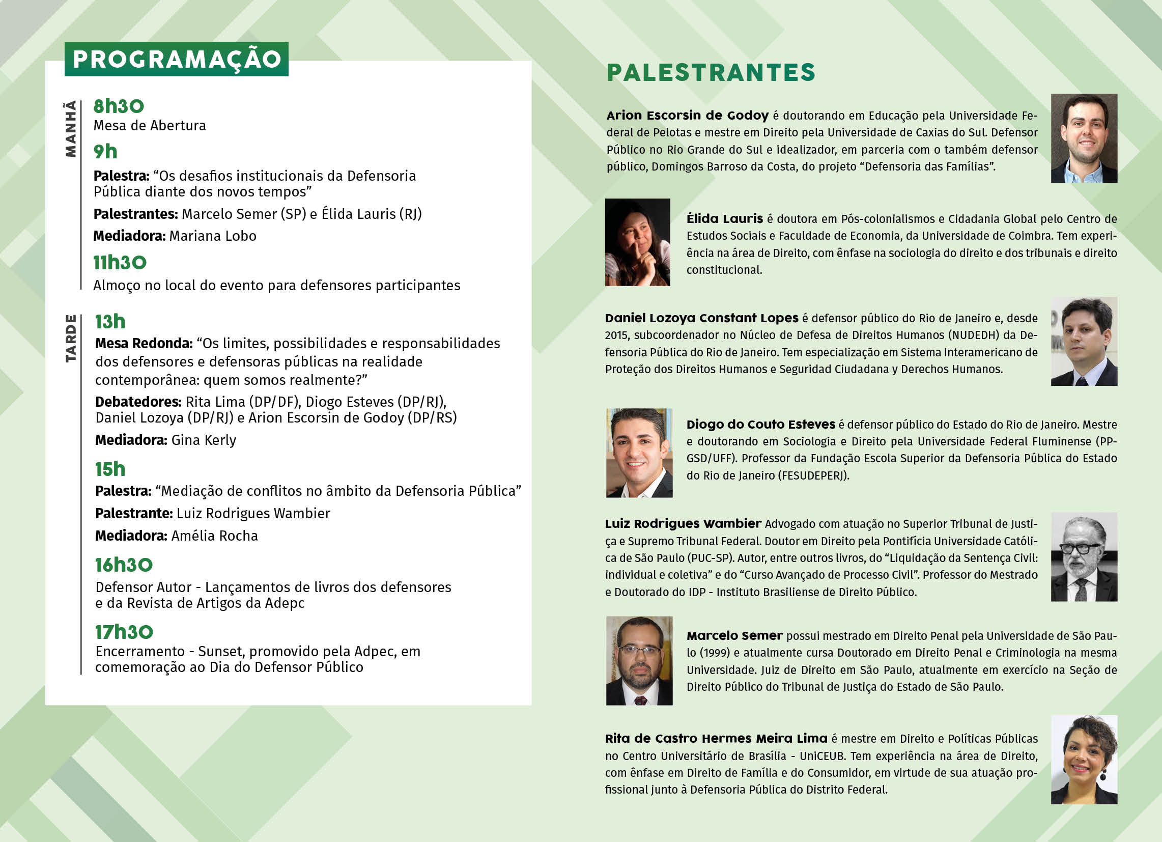No turno da tarde, às 14h, será realizada a mesa redonda “Os limites, possibilidades e responsabilidades dos defensores e defensoras públicas na realidade contemporânea: quem somos realmente?”, com a presença dos defensores públicos Rita Lima (DP/DF), Diogo Esteves (DP/RJ), Daniel Lozoya (DP/RJ) e Arion Erconsin de Godoy (DP/RS).