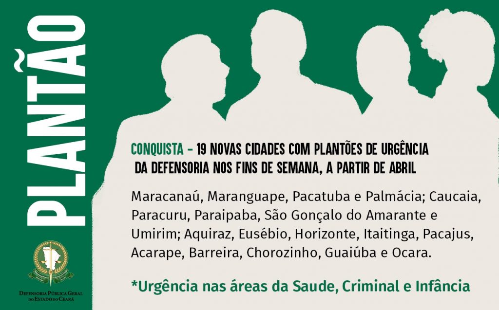 Pelo edital, a Defensoria estabelece três novos plantões no interior do Estado para as áreas de saúde, infância juventude e criminal, expandindo, a partir do mês de abril, a atuação para os municípios: Maracanaú, Maranguape, Pacatuba e Palmácia; Caucaia, Paracuru, Paraipaba, São Gonçalo do Amarante e Umirim; Aquiraz, Eusébio, Horizonte, Itaitinga, Pacajus, Acarape, Barreira, Chorozinho, Guaiúba e Ocara.