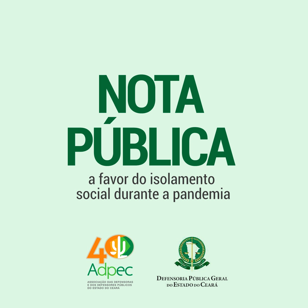 A Defensoria Pública do Estado do Ceará, a Associação das Defensoras e dos Defensores Públicos do Estado do Ceará – ADPEC e a Ouvidoria Geral Externa da Defensoria Pública do Ceará, representante da sociedade civil na instituição, vêm a público reiterar a importância de que a população cearense permaneça em casa, seguindo as orientações das autoridades de saúde para o ISOLAMENTO SOCIAL, neste momento da pandemia do novo coronavirus (Covid-19) no Ceará.