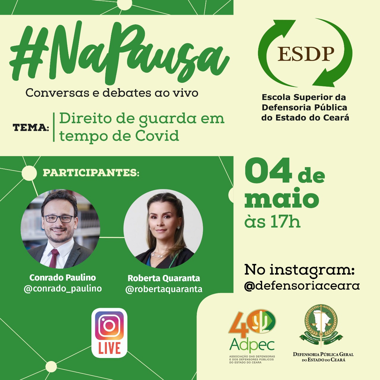 A próxima edição do #NaPausa será em 4 de maio, às 17 horas. A defensora pública Roberta Quaranta receberá o pós-doutor em Direito e presidente da Comissão Especial de Direito de Família e Sucessões da Ordem dos Advogados do Brasil no Rio Grande do Sul (OAB-RS), professor Conrado Paulino, para tratar do tema “Direito de guarda em tempo de Covid”. A transmissão será feita no perfil da DPCE (@defensoriace) no Instagram fruto de parceria da Adpec com a Escola Superior da Defensoria Pública (ESDP) para promover a cidadania nas redes nesse momento de distanciamento social.
