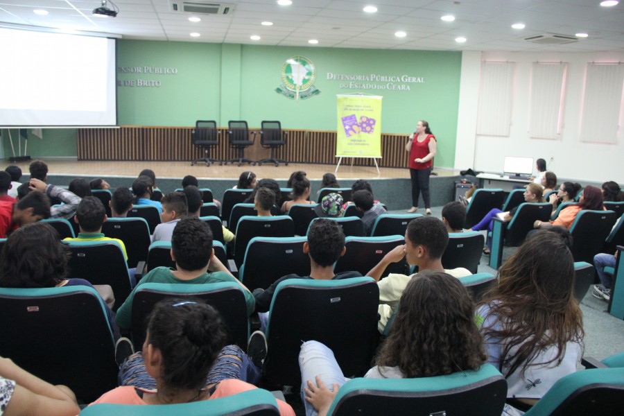 “É viver bem”. “É fazer exercício”. “É se cuidar”. “É prevenir”. “É cantar”. “É dançar”… Essas foram algumas das definições de saúde dadas por adolescentes recolhidos em acolhimentos institucionais durante a realização da primeira oficina de prevenção, na manhã desta sexta-feira (27.04), no auditório Jesus Xavier de Brito, na sede da Defensoria Pública. A oficina é parte do projeto Defensoria Amiga dos Abrigos e foi realizada pelo Núcleo de Defesa dos Direitos da Infância e da Juventude da Defensoria, junto com a Secretaria de Saúde do Estado do Ceará (Sesa), Secretaria Municipal de Saúde (SMS) e a Superintendência do Sistema Estadual do Atendimento Socioeducativo. Sessenta e seis jovens entre 12 e 14 anos recolhidos em oito abrigos participaram da ação.