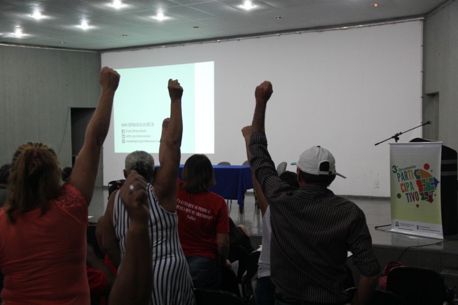 Em sua terceira edição, o Orçamento Participativo da Defensoria Pública fez a primeira audiência deste ano em Canindé, no dia 27 de abril, quando mais de 200 pessoas estiveram presentes. Em Limoeiro o auditório do NIT recebeu cerca de 100 pessoas. Estiveram presentes os defensores públicos Elizabeth Chagas, Amélia Rocha, Ricardo César Pires Batista, José Lino Fonteles, Ana Raíssa Cambraia, Mayara Mendes, Sealtiel Duarte, Francisco Adriano Lima e Lívia Soares. A comitiva do OP vai passar ainda por Barbalha (25.05) e Tianguá (08.06), chegando pela primeira vez a estas cidades para garantir o acesso à justiça e à educação em direitos. A última audiência pública do OP será em Fortaleza, dia 16 de junho, reunindo os municípios que integram a Região Metropolitana.