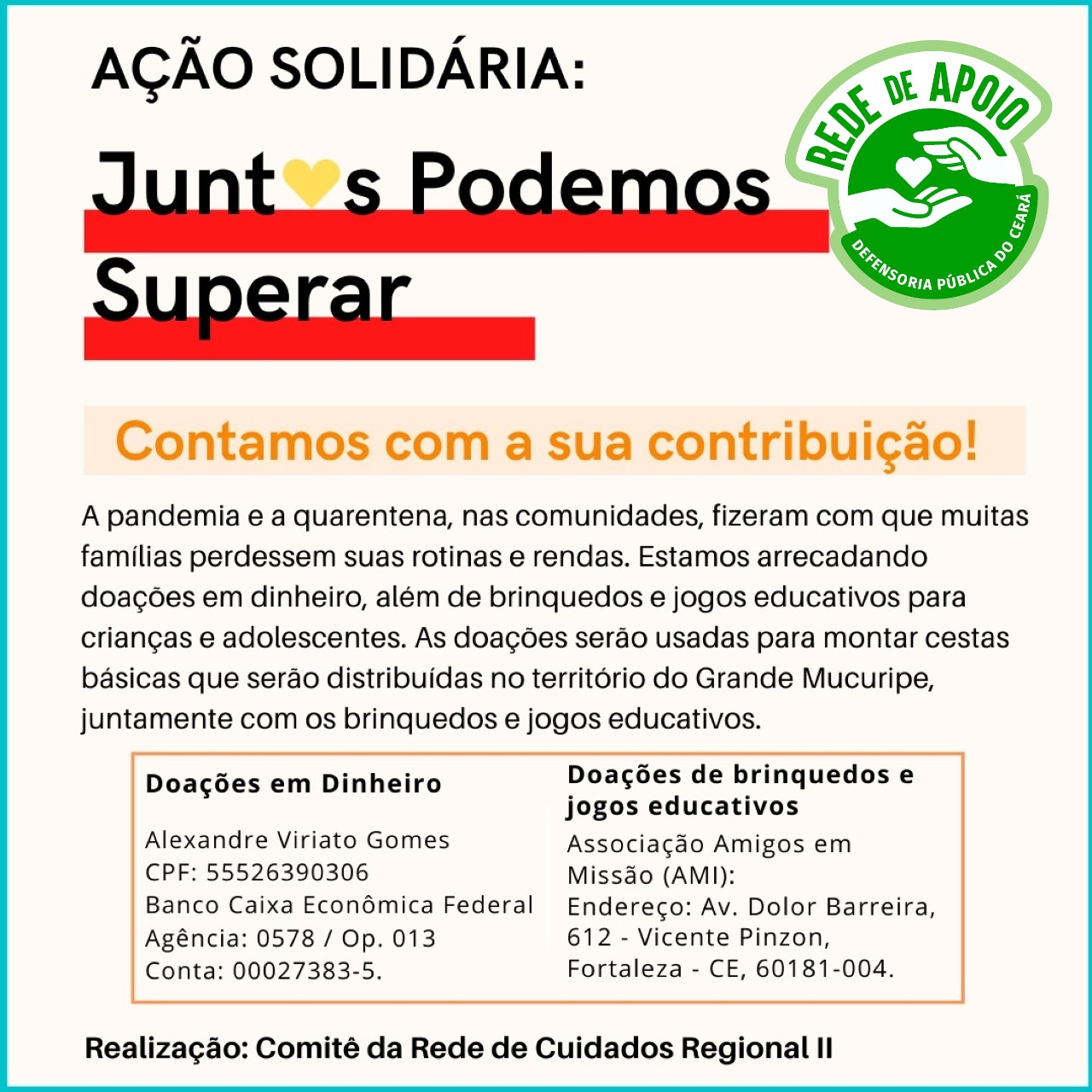 A Campanha “Juntos Podemos Superar” está arrecadando além de jogos educativos e brinquedos, recursos financeiros para montar cestas básicas para atender 200 famílias do grande Mucuripe. A associação Amigos em Missão – entidade sem fins lucrativos – apoia atualmente 80 famílias, oferecendo oficinas de música, culinária, ballet, muay thai e reforço de aprendizado e será uma das beneficiadas.