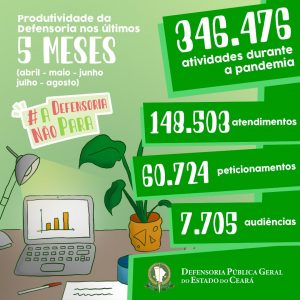 A Defensoria Pública do Estado (DPCE) registrou em agosto aumento de 29,28% na produtividade durante o período de pandemia. Foram efetuadas só no mês passado 78.460 atividades a mais, totalizando 346.476 desde abril, quando começou o modelo remoto de atendimento e os núcleos passaram a receber demandas exclusivamente por ligação, e-mail e Whatsapp.