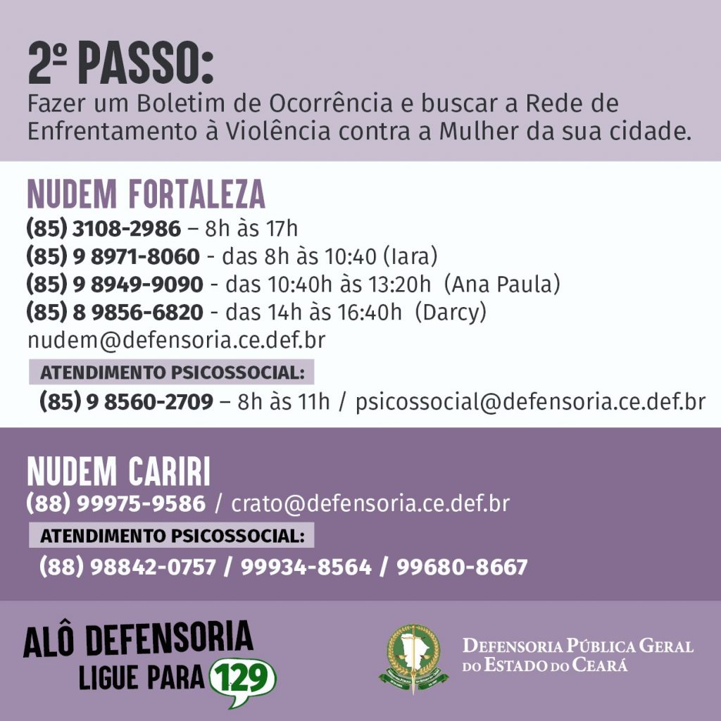 Quando houver a violência física, os defensores orientam a denunciar o mais rápido possível, para que haja a prisão em flagrante e o agressor seja levado até uma delegacia. Daí, o número 190 deve ser acionado, em primeiro plano, pela vítima, vizinhos ou parentes. Caso a violência seja de outra forma (psicológica, sexual, patrimonial, emocional) ou mesmo física, caso demore a denunciar, ainda assim esta vítima deve buscar auxílio na rede de apoio. Em Fortaleza, existe a Casa da Mulher Brasileira, onde estão reunidos diversas instituições de retaguarda. Para o interior que não há, geralmente, estrutura como a Casa da Mulher Brasileira, é importante ligar para a Central de Atendimento à Mulher em Situação de Violência. “Ela entra em contato através do número 180 e eles a orientam acerca de toda a rede, seja Defensoria Pública ou outro órgão que atua no enfrentamento à violência doméstica naquela cidade”, afirma o defensor Rafael Vilar, supervisor do Nudem Cariri.